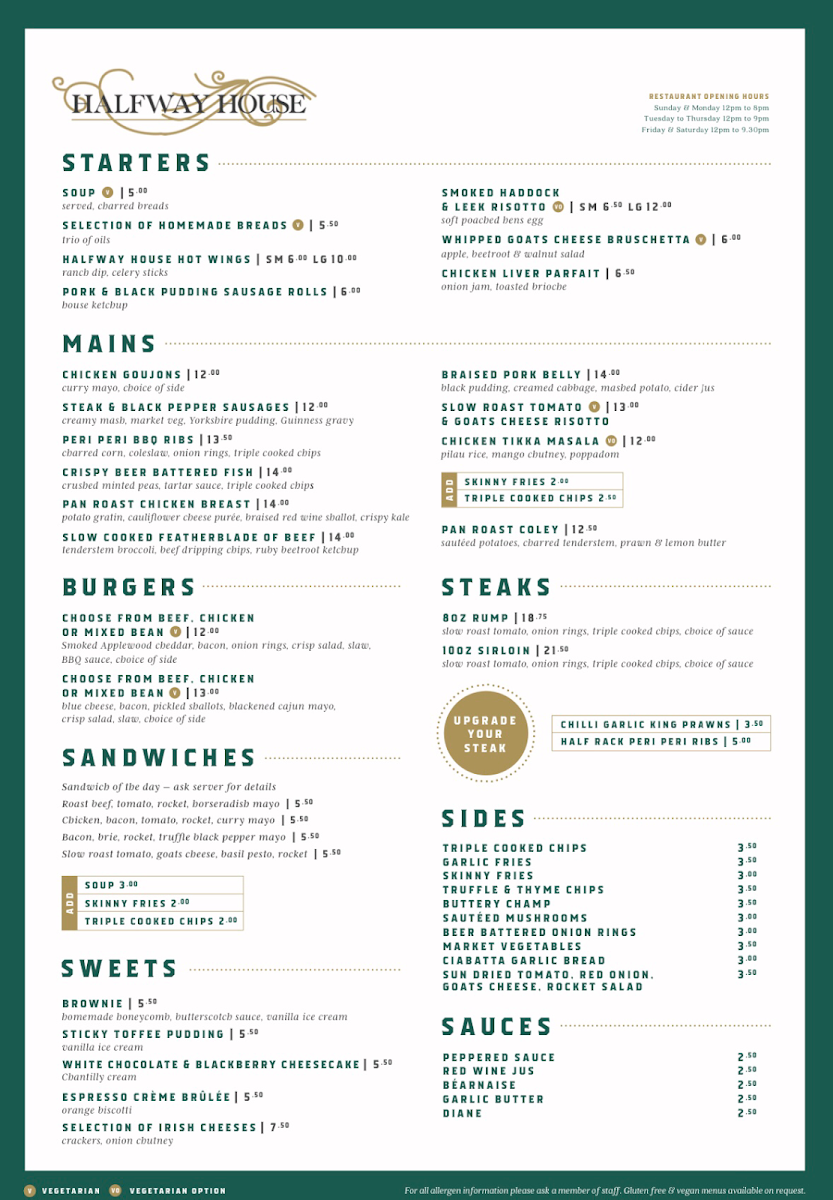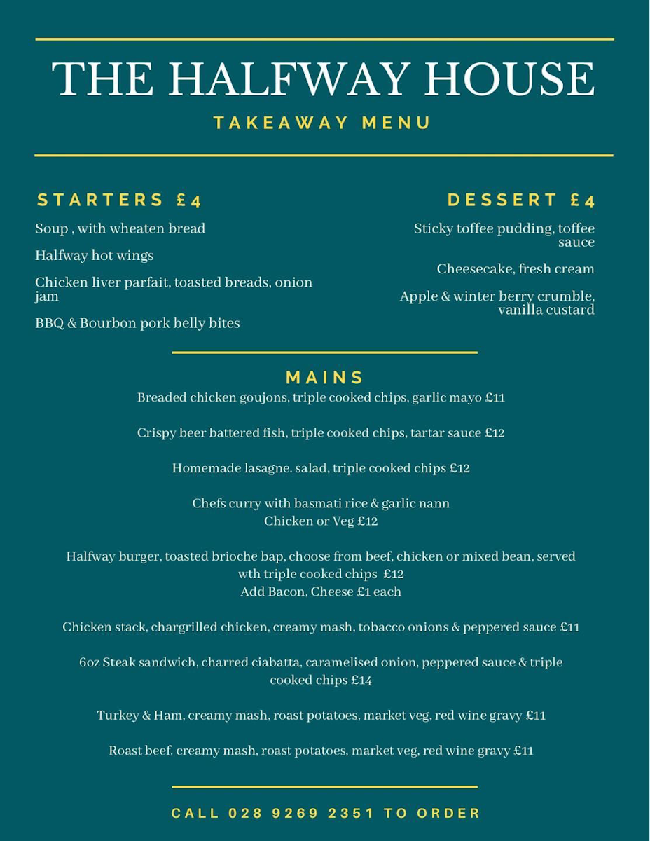 Welcome to The Halfway House, an exceptional dining destination located at 80 Halfway Rd, Banbridge. This inviting eatery presents a menu that beautifully blends comfort and culinary creativity. Highlights include triple cooked chips and skin-on fries, which are perfect companions to hearty mains such as the irresistible Supreme of Chicken and flavorful Chickpea Vegetable Curry.